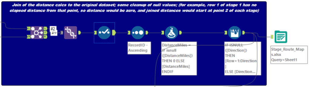 Join of the distance calcs to the original dataset; some cleanup of null values; (for example, row 1 of stage 1 has no elapsed distance from that point, so distance would be zero, and joined distances would start at point 2 of each stage)
