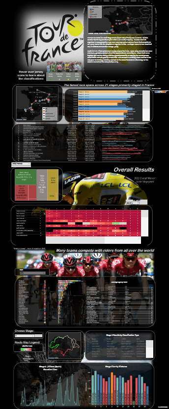 I got caught up watching this reality series on Netflix about the Tour de France. This was something similar to those types of productions like Hard Knocks (for NFL on HBO), All or Nothing for Premier League Soccer (Amazon Prime), and Full Swing (Golf) also on Netflix. This series really gave a newbie like myself a peek into the competitive landscape of competitive bicycle racing. While there are other major races throughout the world; the alpha of them all is the Tour de France. Aside from the true competitive strategies that teams execute; the data side of the sport is really interesting. There are lots of things to really examine on the efficiency of a team and/or rider. After a simple search, I was able to download data for all 2023 stages (route info: coordinates, distances, elevations) and stage results for all riders. I felt this was a great opportunity for me to create a long-form dashboard where the user can examine multiple aspects of the Tour while not getting overwhelmed with data vizzes in the usual one-page style dashboard. I felt that if I can create different visualization cuts while also incorporating some great tour images (from a search) this combination may be a great challenge for my first long-form creation.