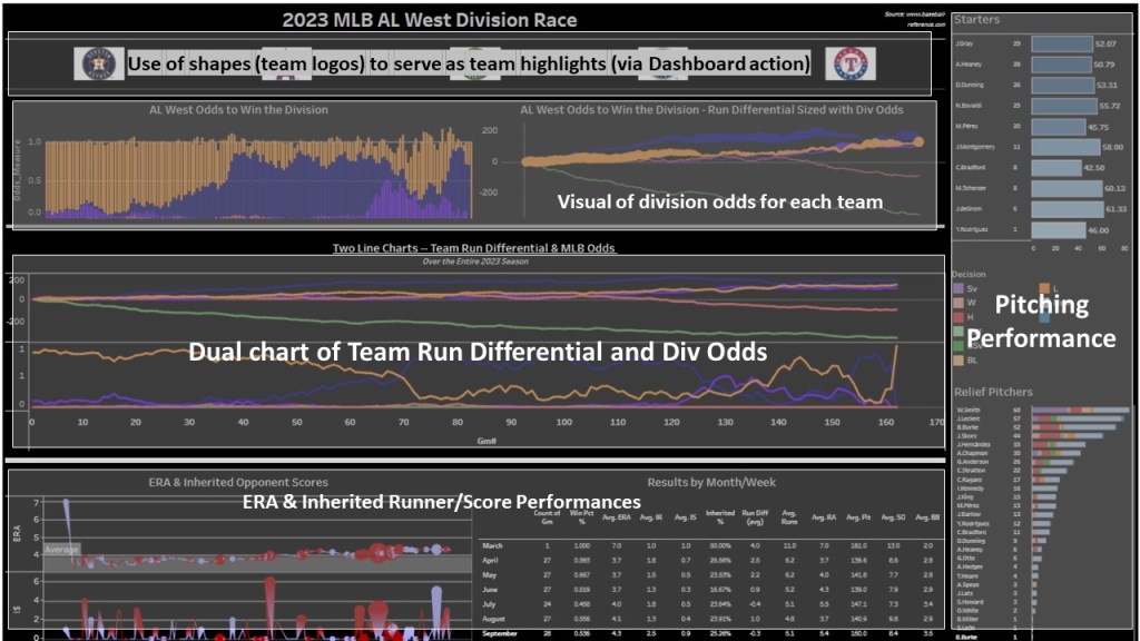 For todays discussion, we take a look at the AL West teams and their performance throughout the season while ALSO looking at a teams’ established postseason odds (as decided by baseball-reference.com). The idea here to is to view a teams’ odds of making the playoffs collectively with its respective performance indicators. What can we uncover when looking at both measures together. For this dashboard I wanted to focus on the Texas Rangers and see if we can identify any pitching KPIs that could have impacted some noticeable struggles throughout the season. While offensive production plays a significant role too, for todays post we will focus on pitching and its impact to the teams performance. The below is a screenshot of the dashboard created (I have overlayed some descriptions of the dashboard real estate):