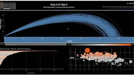 The above blog post helped me in visualizing the top portion of the dashboard while I also wanted to supplement the main visual with a bar chart and scatter plot to provide additional data elements. I used a parameter to drive the color of the bottom views; parameter gives the user the opportunity to change colored measures among some measures (i.e. Top 10 Finishes, Earnings, Fairway Accuracy %, etc.)