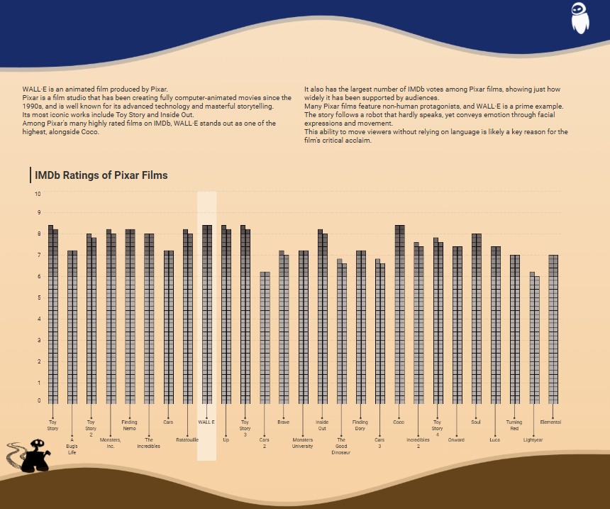 As briefly mentioned in my introduction, I liked the film because just like this dashboard it takes a creative approach at explaining themes that are relevant today. Themes of overconsumption, environmental responsibility, connection and renewal to name a few. Looking even further, this film proved to be a significant step for Pixar as a company. This was their first film post their acquisition from Disney and was a monumental statement that Pixar can still make bold and emotional connections with the audience while still maintaining their creative freedom under Disney. While Wall-E really dives into some mature and thoughtful themes; it captivated audiences and opened the door for Disney to explore these themes in future projects.